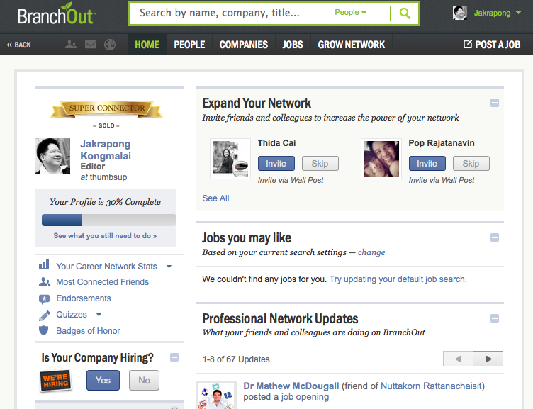 BranchOut คือ เครือข่ายของคนทำงานที่เรียกตัวเองว่า “มืออาชีพ” หรือ “มือปืนรับจ้าง” บน Facebook ที่ใหญ่ที่สุด โดยคนที่เข้ามาใช้ BranchOut จะเข้ามาแชร์โปรไฟล์ตัวเองคล้ายๆ กับที่ทำบน LinkedIn แต่มันดูจะมีแต้มต่อไปกว่า LinkedIn ในบางประการก็คงเป็นเพราะทุกอย่างจะอยู่บน Facebook ที่ได้ผูกเอาโปรไฟล์ของคนทั่วโลกกว่า 750 ล้านคนทั่วโลกไว้บนนี้แล้ว ในขณะที่ LinkedIn มี 100 ล้านคน