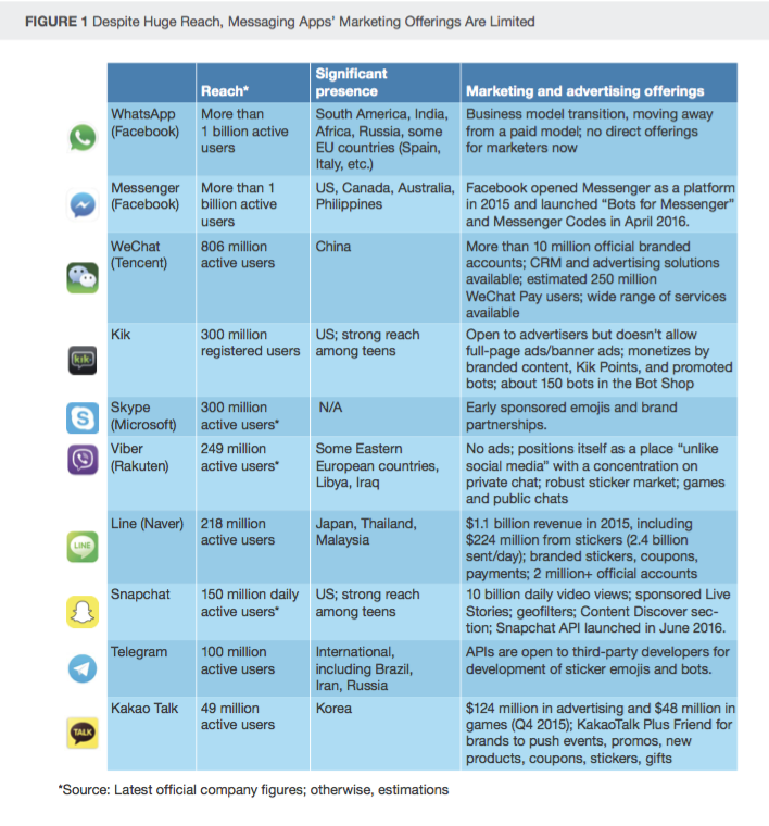 Forrester ลงมือรวบรวมข้อมูลของแอพแชท 10 รายหลักของโลกในรูปตารางเรียบง่าย เรียงลำดับจากฐานผู้ใช้มากไปหาน้อย ขณะเดียวกันก็ให้รายละเอียดว่าชาวออนไลน์นิยมใช้งานแอปนั้นในพื้นที่ใด พร้อมกับประเมินข้อมูลในมิติการตลาดและโฆษณาบนแต่ละแอปได้อย่างเห็นภาพกว้าง