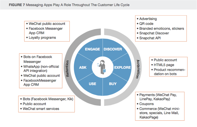 แนวทางนี้เกิดขึ้นแล้วกับ WeChat ที่ประเดิมบนจีนแผ่นดินใหญ่ ทั้งหมดนี้ทำให้ Forrester เชื่อว่าแอปแชทส่วนใหญ่จะพยายามสรรหาคุณสมบัติและบริการตามวงจรการบริโภคหรือ customer lifecycle ทั้งในช่วงซื้อหรือ acquisition phases (discover, explore และ buy) และช่วงหลังซื้อ retention phases (use, ask และ engage) ยิ่งขึ้น