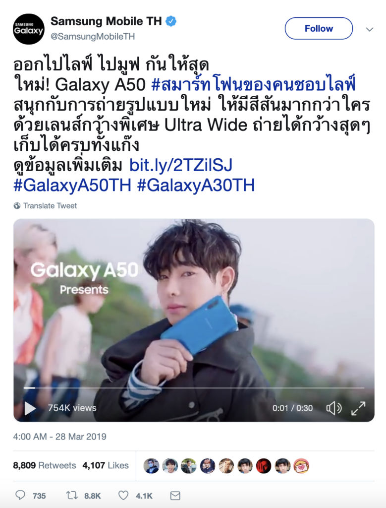 อย่างเช่น Samsung Mobile TH ที่ทำให้สมาร์ทโฟน #GalaxyA50TH กับแคมเปญ #WeMakeADifference เป็นที่กล่าวถึงอย่างมากในช่วงไตรมาสแรกของปี 2562 ซึ่งมีอินฟลูเอนเซอร์และบล็อกเกอร์มาช่วยเน้นถึงฟังก์ชั่นที่แตกต่างของสมาร์ทโฟนรุ่นนี้