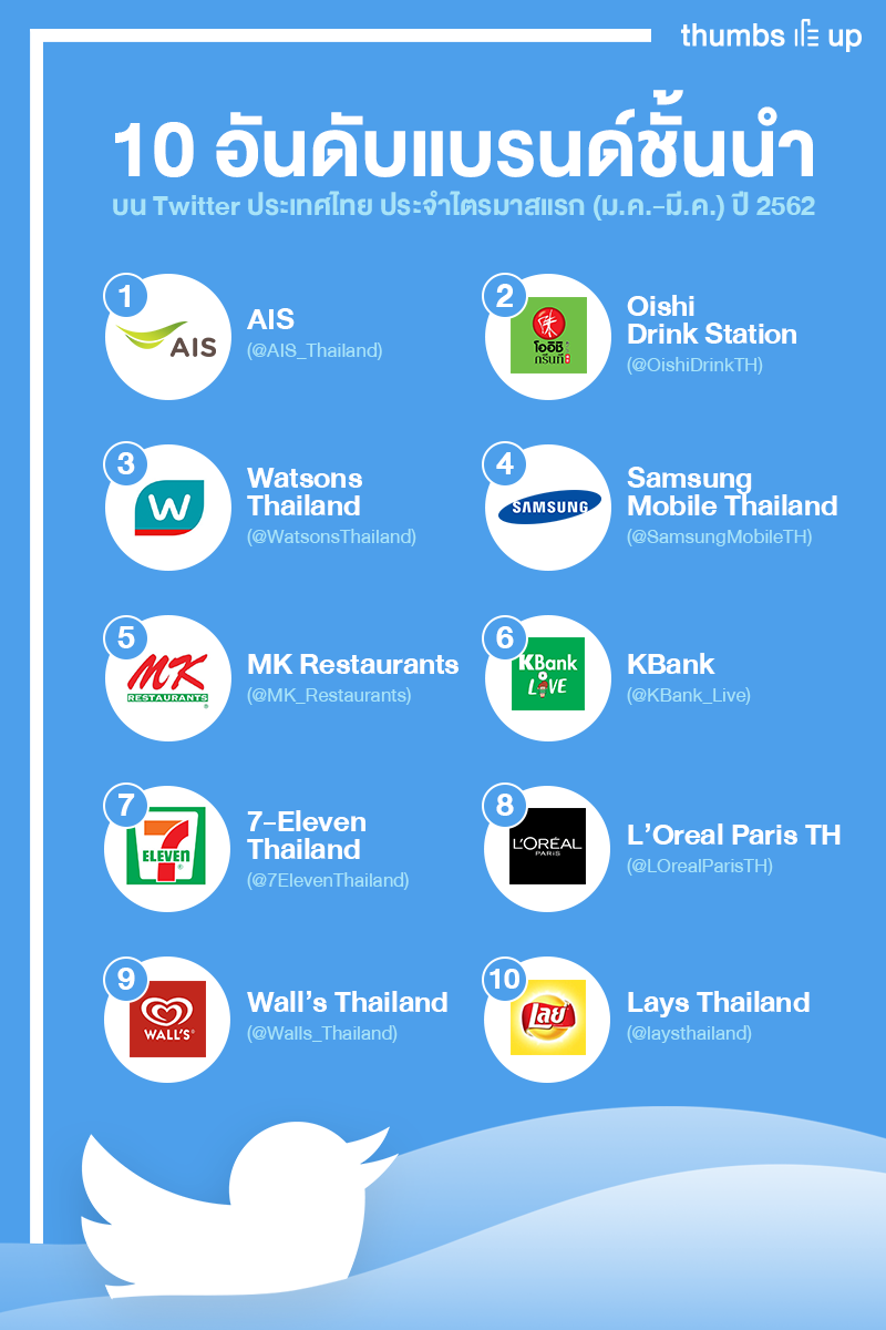 10 อันดับแบรนด์ชั้นนำบนทวิตเตอร์ไทย (ไตรมาสแรก ปี 2562) มีดังนี้