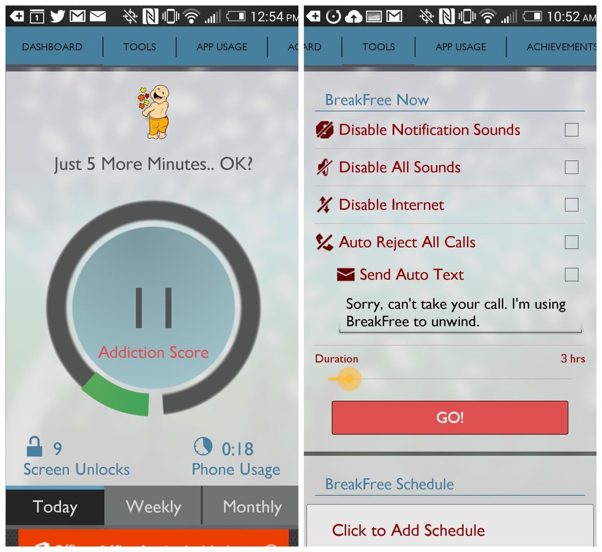 BreakFree จะคอยเตือนว่าผู้ใช้งานว่าพวกเขาใช้เวลากับแอปพลิเคชันใดบ้างเป็นระยะเวลาเท่าใด คุณปลดล็อกหน้าจอสมาร์ทโฟนบ่อยขนาดไหน และคุณใช้เวลาในการโทรศัพท์ระหว่างวันเท่าใด เพื่อคำนวณว่าพวกเขามีติดการใช้งานสมาร์ทโฟนที่คะแนนเท่าใด ก่อนจะส่งข้อความเตือนว่าพวกเขาต้องลดปริมาณการใช้งานได้แล้ว
