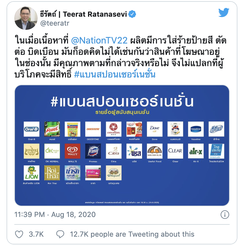 แม้ว่าก่อนหน้านี้จะมีกระแสแบนบนโลกทวิตเตอร์ ที่ส่งผลให้หลายธุรกิจต้องเร่งออกมาสื่อสารกับลูกค้าเพื่อป้องกันปัญหาลุกลาม เช่น กรณีของ #แบนสปอนเซอร์เนชั่น เพื่อเป็นการต่อต้านแบรนด์ที่ลงโฆษณาในช่วงข่าวต่างๆ ของเนชั่น ทำให้หลายแบรนด์ไม่ว่าจะเป็น ฟู้ดแพนด้า ยันฮีวิตามินวอเตอร์ หรือไมเนอร์ กรุ๊ป ต้องออกมาประกาศจุดยืนและบอกว่าตนเองนั้นเป็นกลาง แต่ซื้อโฆษณาผ่านเอเจนซี่เท่านั้น