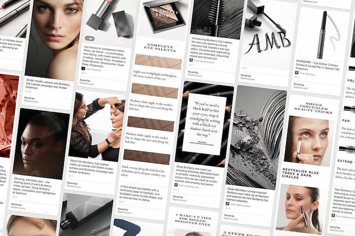 แคมเปญใหม่ล่าสุดของ Burberry นี้เกิดขึ้นบนความร่วมมือกับ Pinterest เพื่อเปิดตัวมาสคาร่า Burberry Cat Lashes Mascara รุ่นใหม่ โดย Burberry ใช้ Pinterest API ในการปรับแต่งเพื่อให้ผู้ใช้สามารถบอกรับคอนเทนต์ที่ถูกกรองแล้วว่าเป็นไปตามแนวทางการแต่งสวยที่ผู้ใช้รายนั้นชื่นชอบ