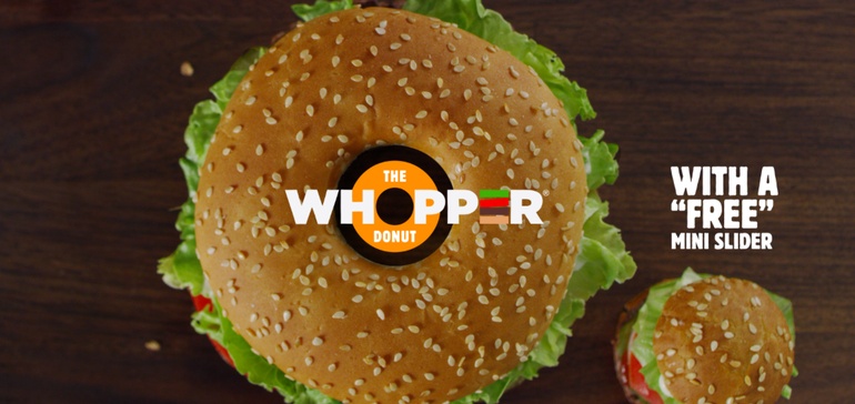 Burger King ตั้งชื่อแคมเปญนี้ว่า Whopper Donut พร้อมกับประกาศว่านี่คือโดนัทชิ้นแรกของโลกที่ใช้วิธีย่างไฟในการผลิต ประเด็นนี้หนีไม่พ้นการแซวคู่แข่งในวงการเบอร์เกอร์ด้วยกัน ว่าไม่มีใครนำเบอร์เกอร์มาย่างไฟเหมือน Burger King โดย Burger King ใช้วิธีเพิ่มคำว่า ever ลงไปด้วยกลายเป็น first flame-grilled donut ever สะท้อนว่าจะไม่มีใครทำได้แบบ Burger King ตลอดกาล