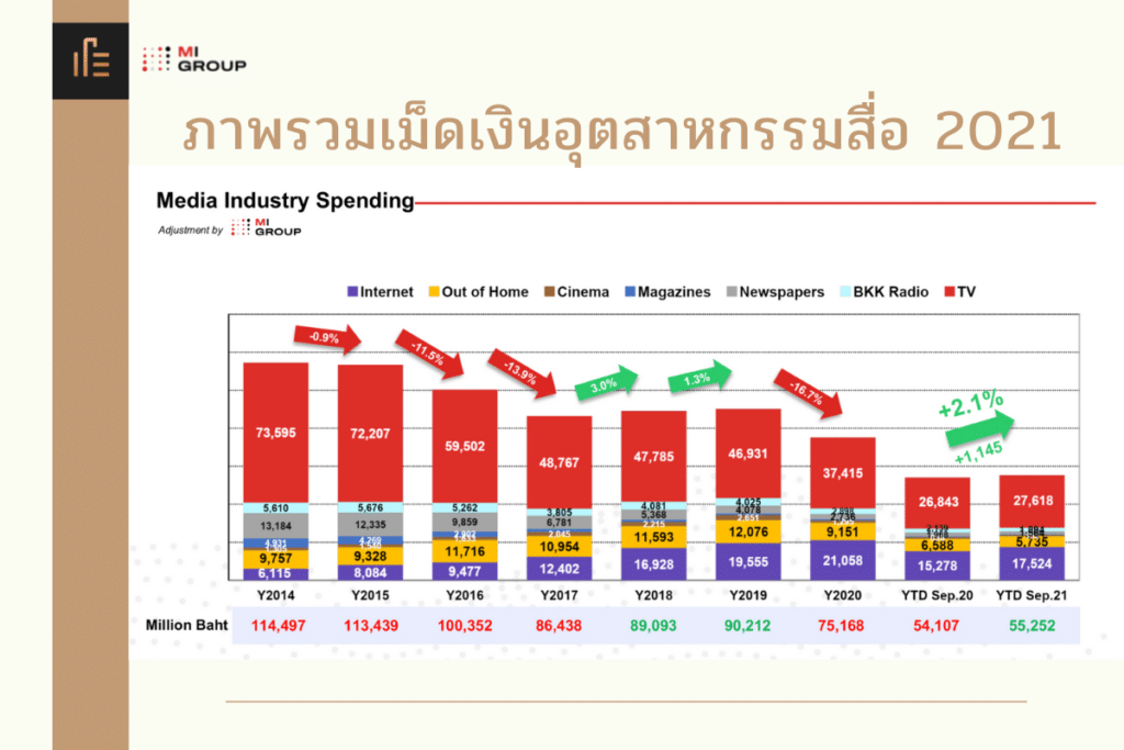 นอกจากนี้ ภาพรวมเม็ดเงินโฆษณาในอุตสาหกรรมสื่อที่ MI เคยคาดการณ์ว่าจะติดลบ 3-5% กลับมีแนวโน้มที่ดีกว่าคาดการณ์คือติดลบเพียง 2.3% ทำให้ตัวเลขภาพรวมทั้งปีอยู่ที่ 73,417 ล้านบาทน้อยกว่าปีที่แล้ว อยู่ที่ 75,000 ล้านบาท