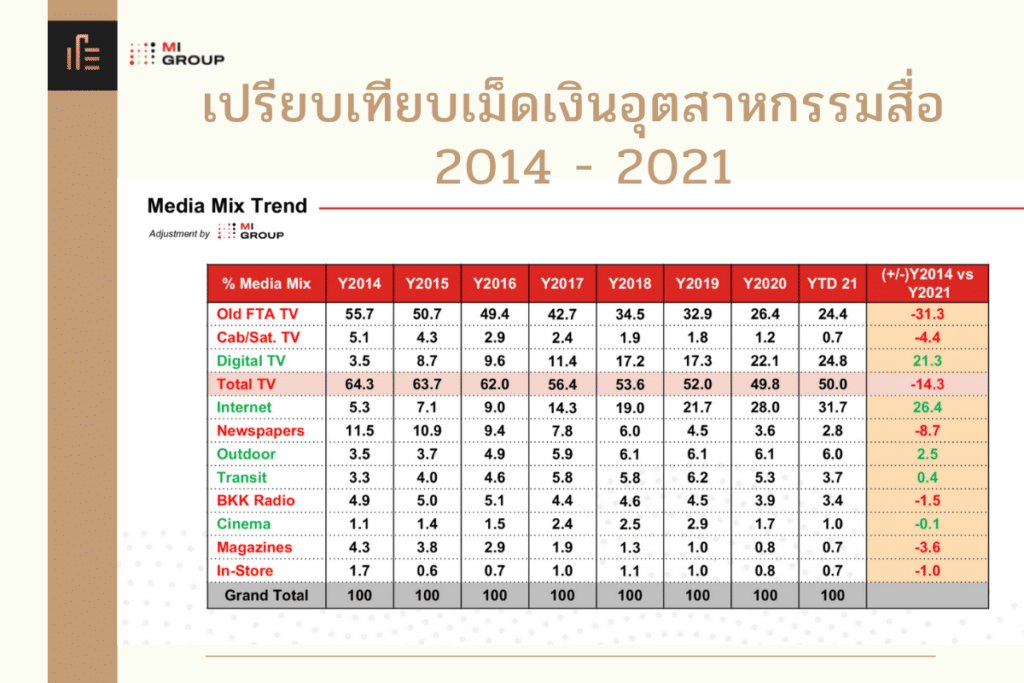 ด้านสื่อทีวีเจอผลกระทบหนัก แม้ว่าช่วงโควิดคนไทยจะเสพสื่อทีวีที่บ้านเยอะขึ้น แต่ก็เจอศึกหนักจากสื่อออนไลน์อย่างเน็ตฟลิกซ์เข้ามาถล่ม ทำพฤติกรรมคนดูรุ่นใหม่เปลี่ยน แต่แนวโน้มการโฆษณาบนสื่อทีวีก็เหมือนจะมีแนวโน้มที่ดีขึ้น สรุปสิ้นปี 2021 ทำสัดส่วนของสื่อทีวีที่เคยอยู่ 70-80% ของภาพรวมอุตสาหกรรมสื่อ มาอยู่ที่ 47.4% เท่านั้น