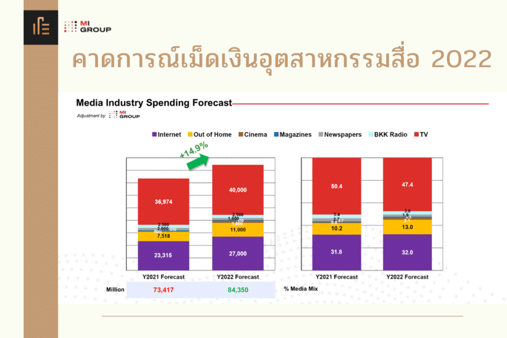 คาดว่าจะช่วยผลักดันเม็ดเงินโฆษณาและสื่อสารการตลาดในปีหน้าเติบโต 2 หลักได้ไม่ยาก โดยเบื้องต้น MI Group คาดการณ์เม็ดเงินอุตสาหกรรมโฆษณา ปี 2565 +15% หรือมูลค่าเกือบ 85,000 ล้าน นัยสำคัญ คือสัดส่วนเม็ดเงินโฆษณาออนไลน์เติบโตแตะ 1 ใน 3 ของเม็ดเงินโดยรวมคือ 32% หรือประมาณ 27,000 ล้านบาท