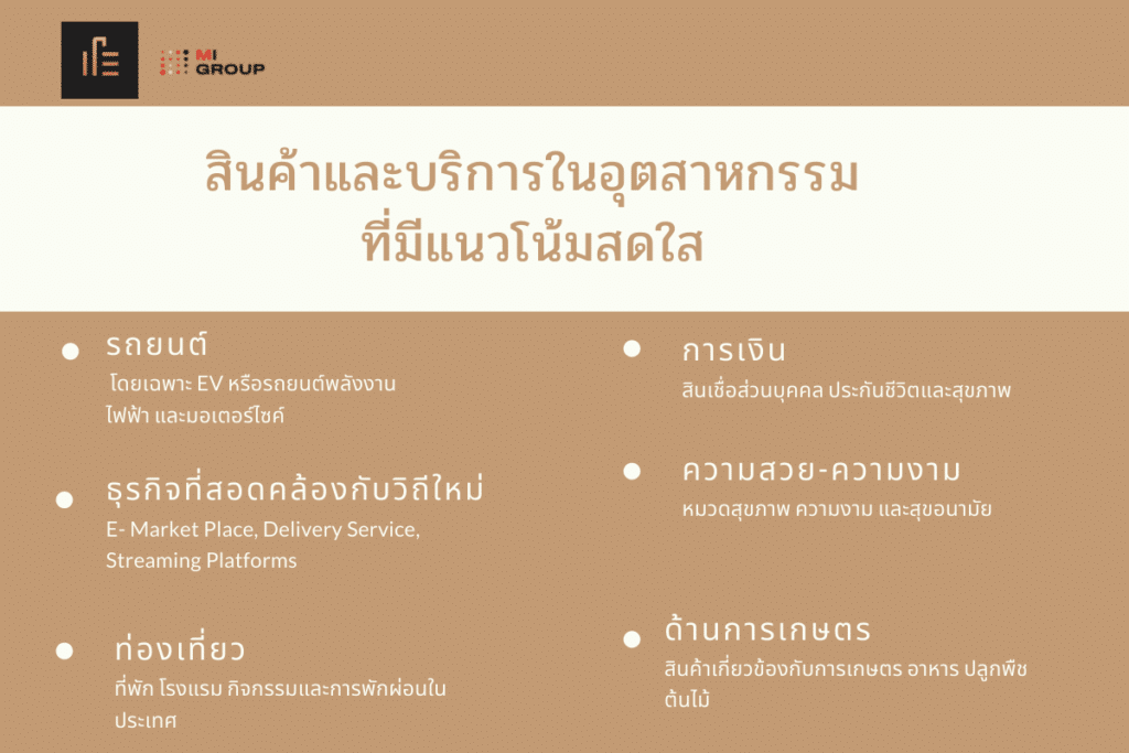 - ธุรกิจที่สอดคล้องกับวิถีใหม่ อาทิ E- Market Place, Delivery Service, Streaming Platforms
