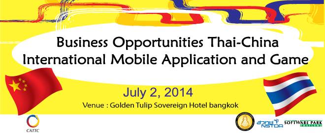 ฝ่ายการตลาด สวทช. และ Software Park Thailand ขอเชิญผู้ประกอบการด้านการพัฒนา Mobile Application และ Game หรือธุรกิจที่เกี่ยวข้อง เข้าร่วมงานประชุมสัมมนาและจับคู่ธุรกิจในงาน “Business Opportunities: Thai-China International Mobile Application and Game Conference” ในวันพุธที่ 2 กรกฎาคม 2557 ณ โรงแรม Golden Tulip Sovereign Hotel ห้วยขวาง กรุงเทพฯ (ไม่มีค่าใช้จ่าย) พบกับนักธุรกิจจากบริษัทชั้นนำด้าน Mobile และ Social Network จากประเทศจีนกว่า 30 บริษัท
