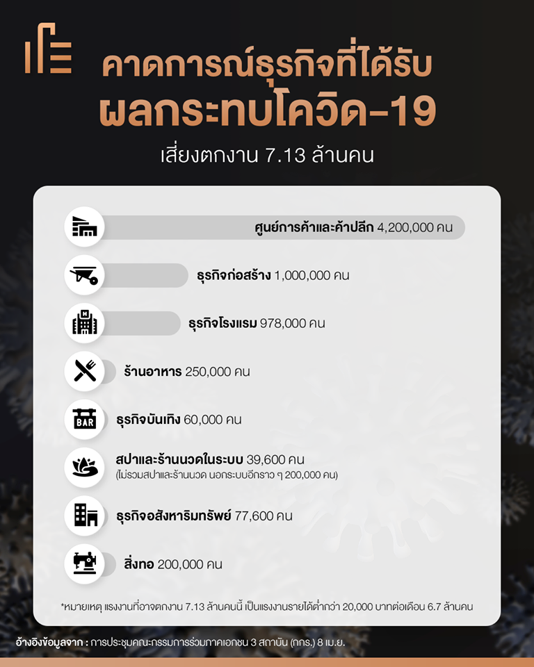 โดยคาดว่า มีคนตกงานไม่ต่ำกว่า 7 ล้านคน ซึ่งในจำนวนนี้มีประมาณ 6 ล้านคน ที่มีรายได้ต่ำกว่า 20,000 บาทต่อเดือน จากแรงงานทั้งระบบของประเทศมี 38 ล้านคน