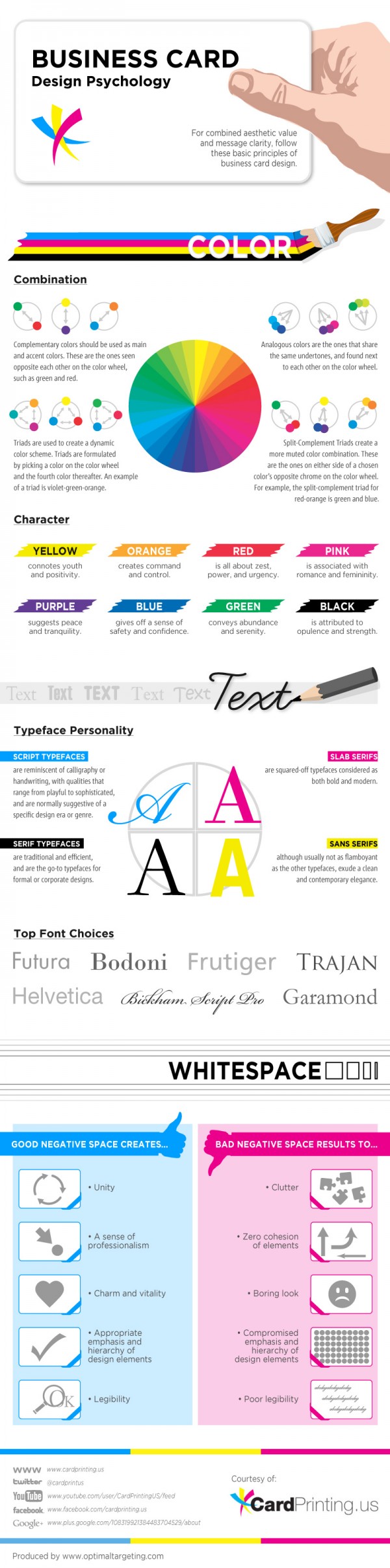 เว็บไซต์ Cardprinting.co.us ได้ทำการรวบรวมขั้นตอนในการออกแบบนามบัตรให้มีความโดดเด่นลงตัว และดึงดูดความสนใจของผู้รับมากขึ้น โดยขั้นตอนทั้ง 3 ข้อประกอบด้วย การเลือกใช้สี, รูปแบบของตัวอักษร และการจัดองค์ประกอบ
