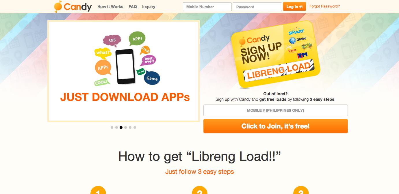 เพียงแค่ล็อคอินด้วยหมายเลขโทรศัพท์มือถือ (ปัจจุบันรองรับเครือข่าย AIS dtac และ True Move) หลังจากนั้นทาง Candy จะมีภารกิจให้เลือกทำที่แตกต่างกันไปเพื่อแลกกับการเติมเงินฟรี เช่น ดาวน์โหลดแอปพลิเคชั่น ตอบแบบสอบถามผ่านทาง SMS หรือชวนเพื่อนมาใช้บริการเพิ่ม ฯลฯ เพียงแค่นี้ก็จะได้รับยอดเข้าบัญชี Candy ของคุณ เมื่อสะสมครบตามเป้าที่กำหนดไว้จะได้รับการเติมเงินฟรี โดยข้อมูลที่ได้มาทางผู้ให้บริการ Candy ยืนยันว่าจะไม่มีการนำข้อมูลส่วนบุคคลไปใช้ในเชิงพาณิชย์ก่อนการได้รับอนุญาต