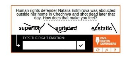 ตัวอย่างเช่นคำถามว่า “ในโคโซโว ผู้คนมากมายถูกทรมานอยู่ในสถานกักกัน เรื่องนี้คุณรู้สึกอย่างไร?” โดยจะปรากฏ 3 ตัวเลือกให้ผู้ใช้ใส่ในระบบ Captcha เพื่อตรวจสอบสแปม ได้แก่ “ตื่นเต้น (excited)”, “ข้องใจ (bothered)” และ “ดี (great)”