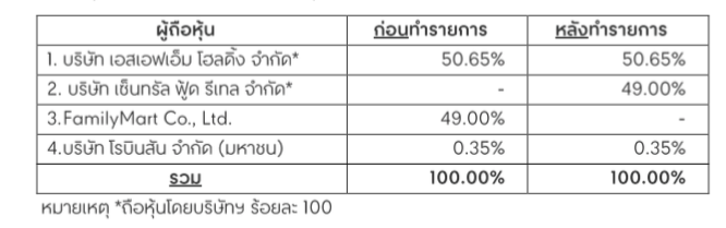 โดยบริษัทลูกของเซ็นทรัล รีเทล 2 บริษัท จะถือหุ้นของร้าน FamilyMart รวมกัน 99.65% ได้แก่ บริษัท เอสเอฟเอ็ม โฮลดิ้ง จำกัด ถือหุ้นในสัดส่วน 50.65% และบริษัท เซ็นทรัล ฟู้ด รีเทล จำกัด ถือหุ้นในสัดส่วน 49%