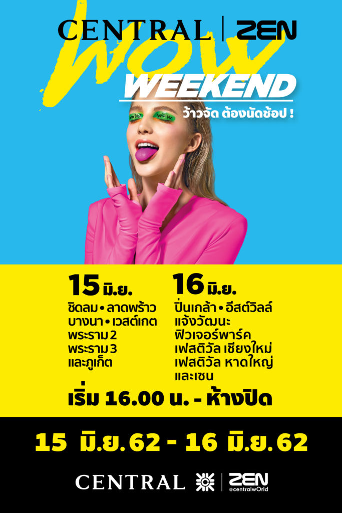 ว้าวจัด ต้องนัดช้อป!! 2 วันที่ห้ามพลาด 15-16 มิถุนายน 2562 ห้างเซ็นทรัล และเซน จัดงาน “Central | ZEN WOW Weekend”สินค้าใหม่ลดทั้งห้างฯ สูงสุด 50% พร้อมกับโปรโมชั่นโดนๆ ลดรับเพิ่มสูงสุด 34% เมื่อใช้บัตรเดอะวันพร้อมบัตรเครดิตเซ็นทรัล เดอะวัน หรือ ลดรับเพิ่มสูงสุด 31% จากบัตรเดอะวันและบัตรเครดิตที่ร่วมรายการ ช้อปกันอย่างจุใจ