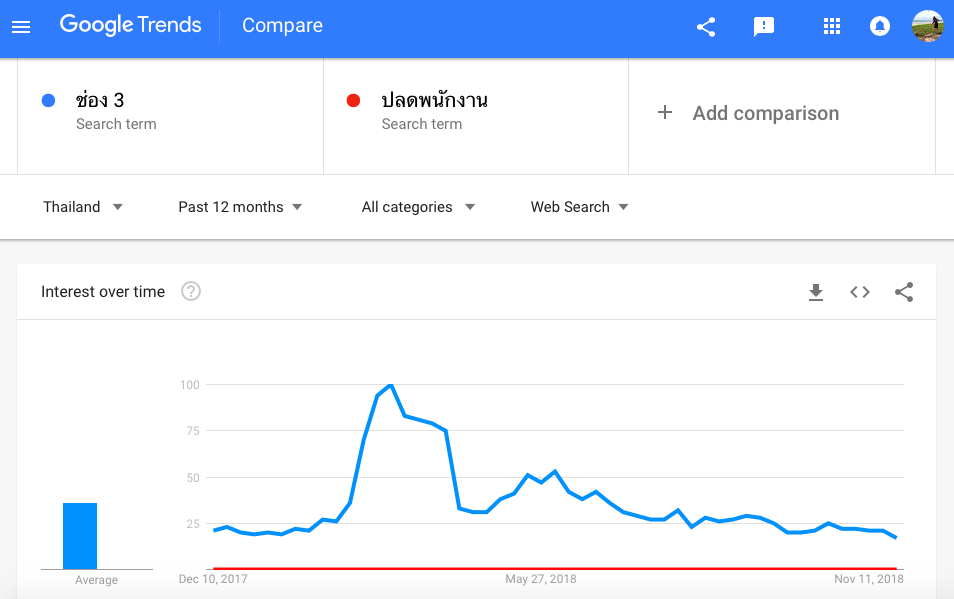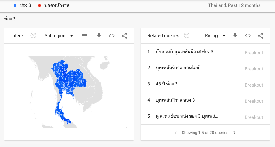 หากจะบอกว่ากระแสนี้เป็นแค่ไฟไหม้ฟางที่มาเพียงวูบเดียวแล้วจางไปก็ได้ เพราะเมื่อพิจารณาถึงคีย์เวิร์ดอย่าง “ช่อง 3” การค้นหาบน Google Trend นั้นที่เกี่ยวข้องกับการปลดพนักงานฝ่ายข่าวนั้นมีน้อยมาก และส่วนใหญ่ยังเป็นการค้นหาคอนเทนต์ของช่อง 3 อย่างเหนียวแน่น