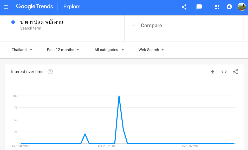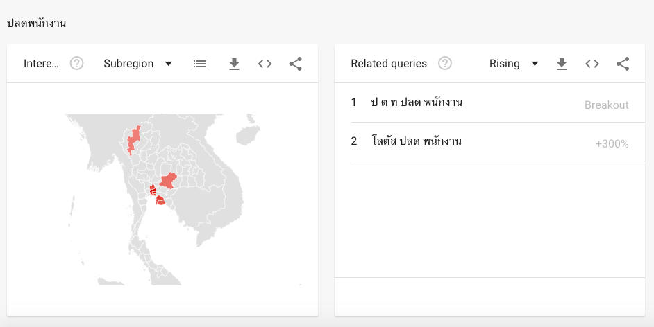 การค้นหาคำว่า “ปลดพนักงาน” ก็ไม่ได้ฮอตบน Google จุดนี้แสดงว่าคนทั่วไปไม่ได้สนใจค้นหาข้อมูลเรื่องนี้ต่อบนเสิร์ชเอนจิ้น