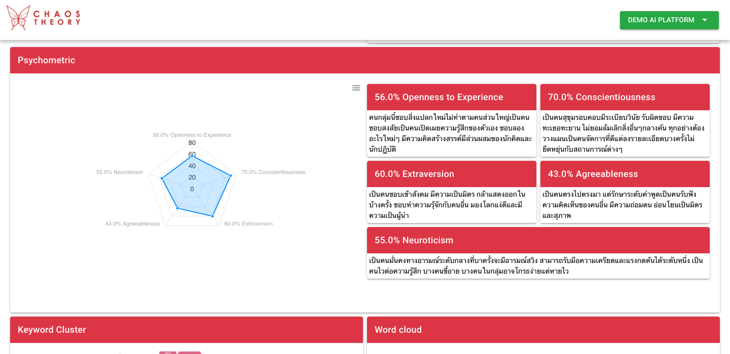 ส่วน “โมเล็ก” (ชื่อในออนไลน์คือ @molek) หรือ ฉกาจ ชลายุทธ Co-Founder & Visionary แห่ง Chaos Theory เผยว่า ในต่างประเทศมีการ วางแผนกลยุทธ์การตลาดและการสื่อสารด้วยการดูจากการทำนายพฤติกรรม-จิตวิทยา (Personality & Psychology) และ Keyword นอกเหนือจากการดูแค่ความสนใจ (Interest) แบบกว้างๆ เพียงอย่างเดียว ทำให้ต้องการสร้างบริการดังกล่าวในประเทศไทยบ้าง