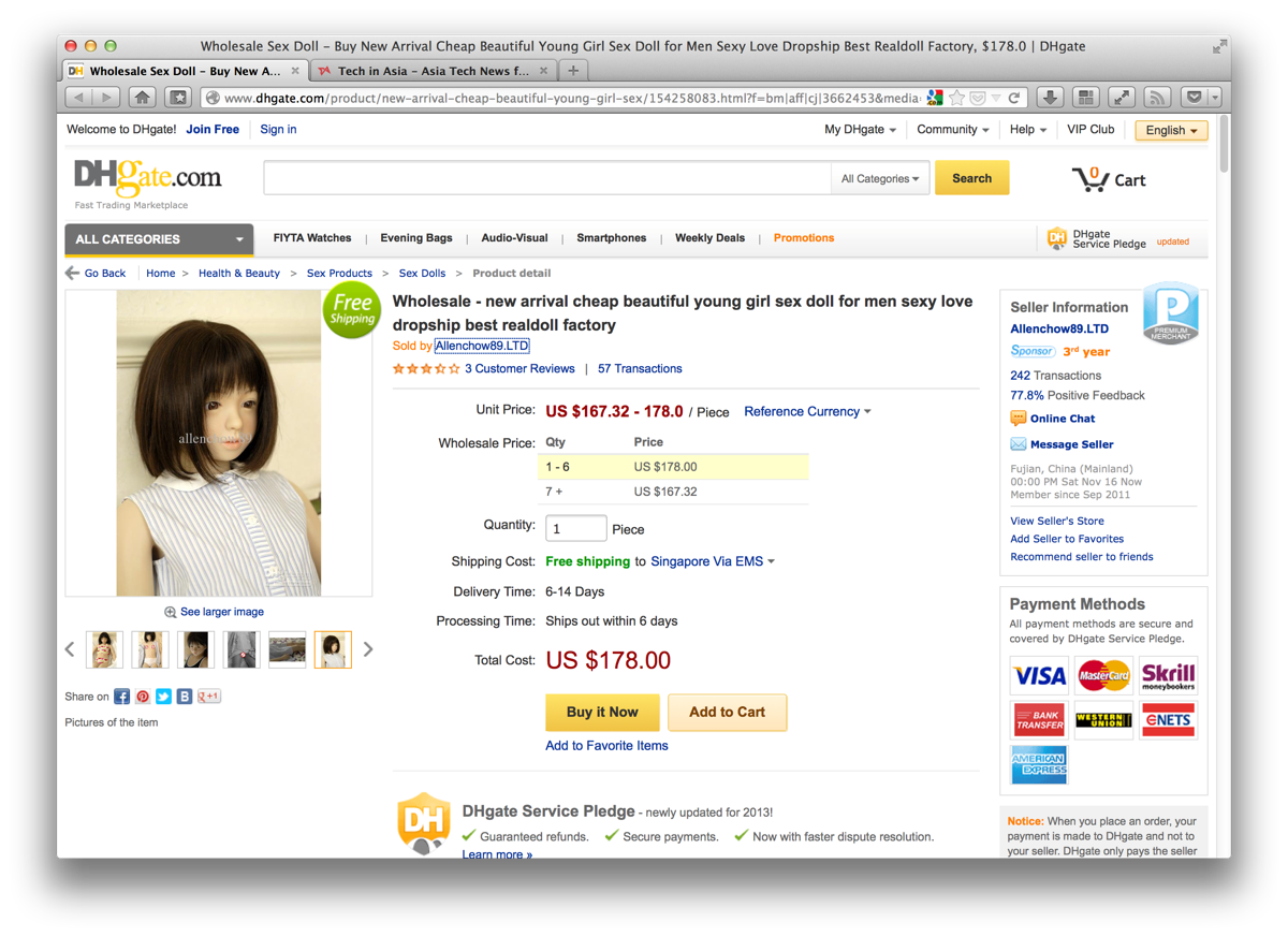 allenchow89 บรรยายสรรพคุณตุ๊กตายางไซส์เด็กของตัวเองอย่างชัดเจนว่าเป็นตุ๊กตาเด็กหญิงน่ารักสำหรับผู้ชายหรือ “beautiful young girl sex doll for men” พร้อมจัดส่งทั่วโลกในราคาตัวละ 178 เหรียญสหรัฐ หรือประมาณ 5,600 บาท