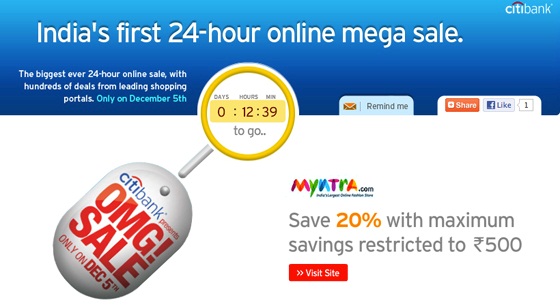 Citibank อินเดียต้องการโปรโมทการซื้อสินค้าผ่านทางออนไลน์ จึงจัดมหกรรมลดราคาสินค้าครั้งยิ่งใหญ่ตั้งแต่ 30%-60% ในเวลาเที่ยงตรงของวันที่ 5 ธันวาคมจนถึงเที่ยงตรงของวันที่ 6 ธันวาคมที่ผ่านมา โดยให้สิทธิเฉพาะผู้ถือบัตรของ Citibank ซื้อสินค้าผ่านร้านค้าปลีก 17 เว็บไซต์ดังแดนโรตี ซึ่งส่วนหนึ่งเป็นเว็บไซต์อย่าง indiatimes.com, ebay.in, snapdeal.com และ indiaplaza.com เป็นต้น