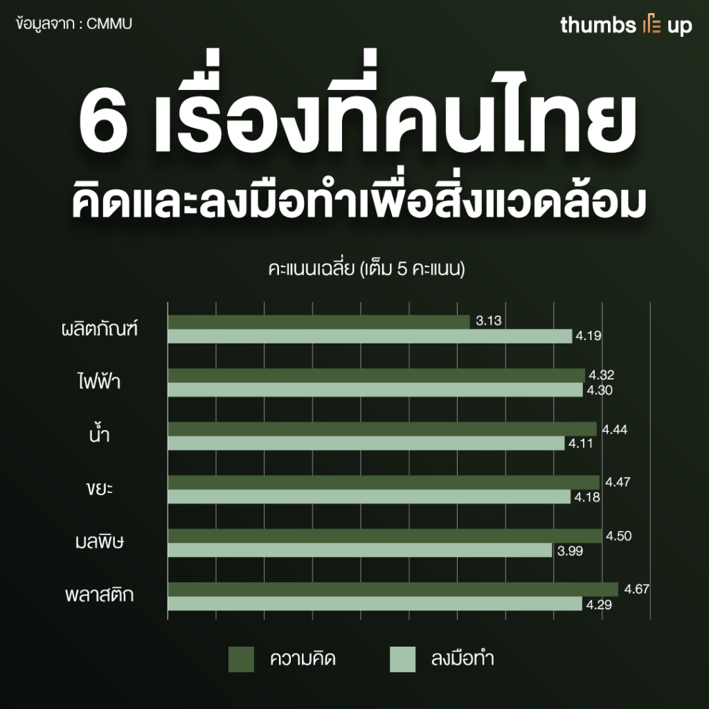 เรื่องที่ยังคงเป็นปัญหาสูงสุดที่คนไทยหันมาใส่ใจธรรมชาติมากขึ้นคงหนีไม่พ้นเรื่องของการคิดและลงมือจัดการด้านสิ่งแวดล้อม ซึ่งพลาสติกยังคงเป็นเรื่องที่คนไทยให้ความสนใจและตระหนักถึงปัญหานี้มากที่สุด ตามมาด้วยอันดับสองคือเรื่องของมลพิษทางอากาศ PM2.5 และฝุ่นควันต่างๆ อันดับ 3 คือเรื่องของการแยกขยะ ใช้ซ้ำและนำกลับมาใช้ใหม่ อันดับ 4 คือการประหยัดและอนุรักษ์น้ำ อันดับที่ 5 คือเรื่องการลดการใช้พลังงานไฟฟ้า