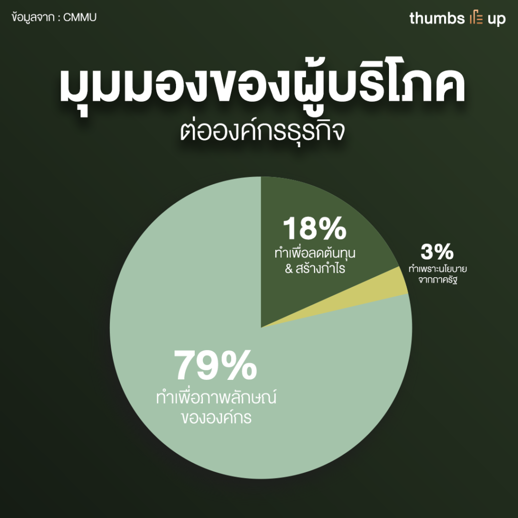 มีองค์กรจำนวนมากที่พยายามใช้การรักษ์โลก หรือรักษาสิ่งแวดล้อมเข้ามาช่วยในเรื่องของความเป็นแบรนด์ให้มากขึ้น ซึ่งผู้บริโภคมองว่า 79% ทำเพื่อภาพลักษณ์องค์กร 18% ทำเพื่อลดต้นทุนและสร้างกำไร สุดท้ายอีก 3% ทำเพราะเป็นนโยบายจากภาครัฐ