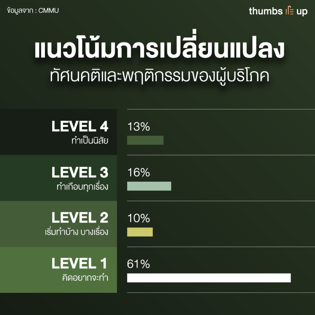 ทางด้านของการเปลี่ยนแปลงความคิดและการกระทำออกเป็น 4 ระดับ คือ มีความคิดที่จะหันมาใส่ใจสิ่งแวดล้อม 61% กลุ่มที่มีความคิดจะเปลี่ยนพฤติกรรมมาใส่ใจสิ่งแวดล้อมแต่ยังติดเงื่อนไขเรื่องเงินทอง อยู่ที่ 10% กลุ่มที่มีพฤติกรรมใส่ใจสิ่งแวดล้อมบ้างและยอมจ่ายในราคาที่สูงขึ้น 16% สุดท้ายคือทำจนเป็นนิสัยอยู่ที่ 13%