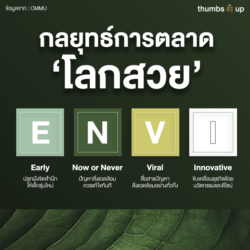 การจะเปลี่ยนพฤติกรรมของคนให้มารักษ์โลกอย่างแท้จริงนั้นจะต้องใช้กลยุทธ์ที่ชื่อว่า ENVI ประกอบด้วย 4 ด้านคือ
