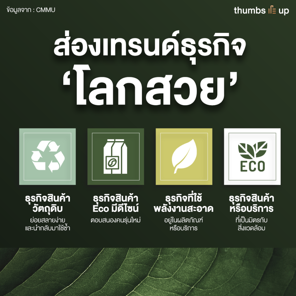 - ธุรกิจสินค้าวัตถุดิบที่ย่อยสลายง่ายและนำกลับมาใช้ซ้ำ จะมีแบรนด์รุ่นใหม่มากขึ้น