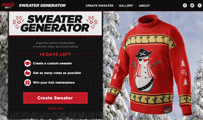 ผู้ที่สนใจสามารถออกแบบเสื้อกันหนาวไหมพรมในแบบของตัวเองผ่านทางเว็บแอพพลิเคชั่น ซึ่งสามารถเลือกรูปแบบการตัดเย็บ, สี, ลายผ้า หรือสัญลักษณ์ต่างๆ ลงไปได้ตามที่ต้องการ จากนั้นก็แชร์เสื้อที่ตัวเองออกแบบบน Facebook หรือ Twitter และชวนเพื่อนๆ มากด like กันให้เยอะที่สุด โดยสามารถติดตามความเคลื่อนไหวของแคมเปญได้ผ่านทาง #sweatergenerator บน Twitter