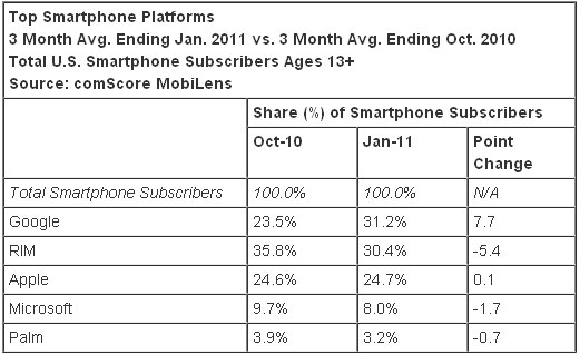 หลังจากเมื่อช่วงตุลาคมปีก่อน Android OS มีส่วนแบ่งการตลาดอยู่เพียงอันดับ 3 และตามหลังผู้นำทางด้านจำนวนผู้ใช้บริการจาก RIM เจ้าของสมาร์ทโฟนชื่อดังอย่าง BlackBerry อยู่พอสมควร และก็มีส่วนแบ่งอยู่หลัง Apple อยู่ แต่คล้อยหลังเพียงสามเดือน คือเดือนมกราคมที่ผ่านมา RIM กลับมีส่วนแบ่งการตลาดที่ลดลงอย่างมาก คือลดลงประมาณร้อยละ 5.4 แต่กลับเป็น Google ที่ทำให้ Android ติดลมบน สามารถแย่งส่วนแบ่งมาได้มากขึ้นถึงร้อยละ 7.7 ส่วน Apple เองไม่มีการเปลี่ยนแปลงมากนัก