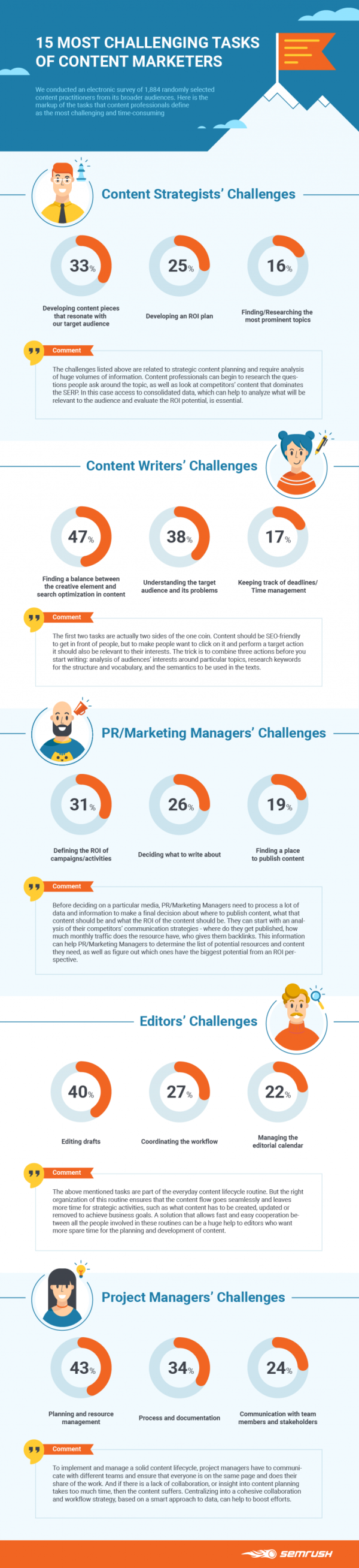 จากการศึกษาของบริษัท SEMRush และสถาบัน Content Marketing Institute ที่สัมภาษณ์กลุ่มผู้สร้างเนื้อหา 1,844 ราย ถึงคำถามเกี่ยวกับความผิดหวังในที่ทำงานหรืองานที่ทำอยู่ พบว่านักวางยุทธศาสตร์เนื้อหาหรือ Content strategists กังวลเรื่องการสร้างเนื้อหาที่โดนผู้ชมมากที่สุด (33 เปอร์เซ็นต์)