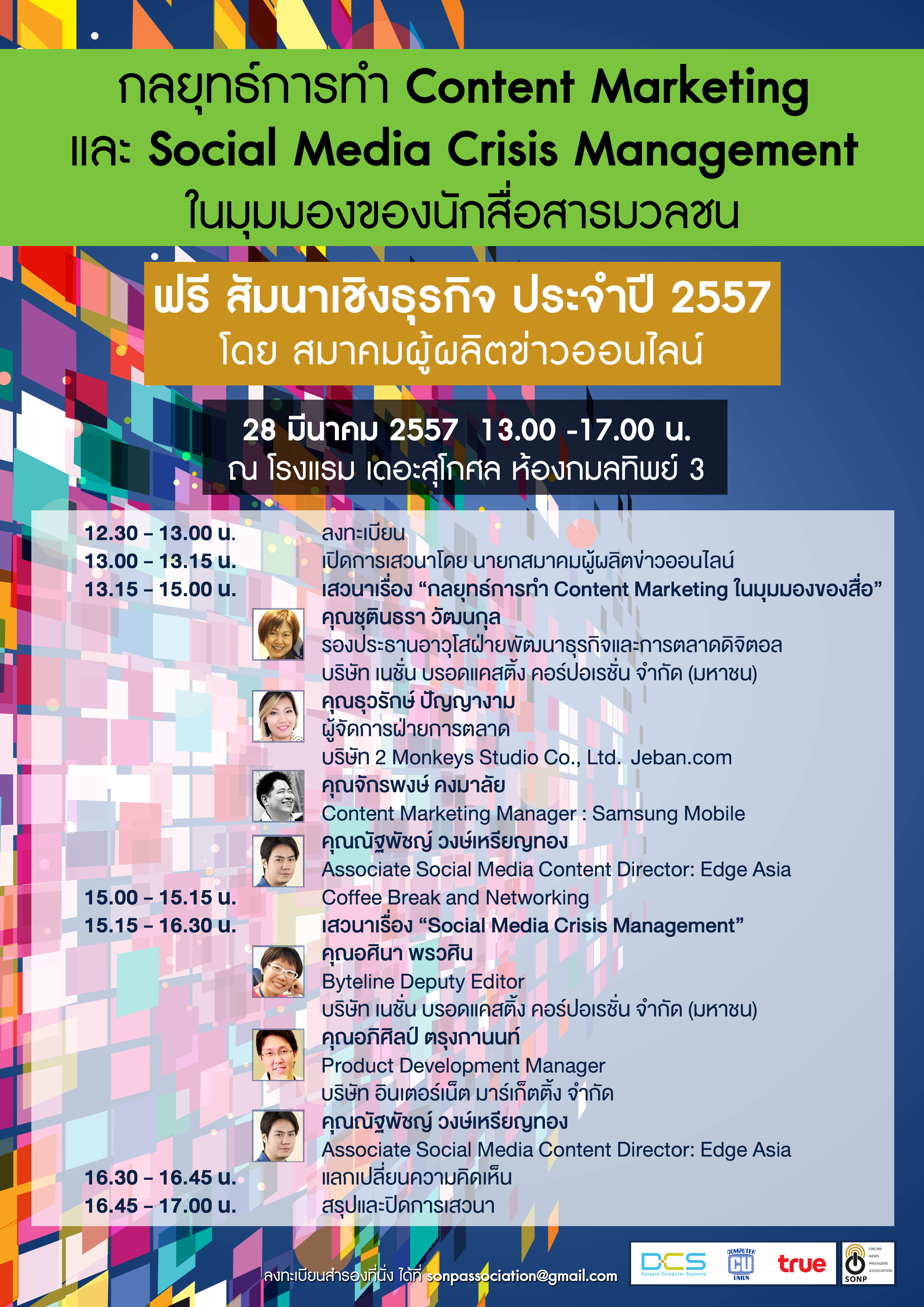 วัตถุประสงค์เพื่่อให้เกิดการแลกเปลี่ยนเรียนรู้เรื่องการสร้าง Content Marketing ระหว่างผู้ผลิตสื่่อออนไลน์และเจ้าของแบรนด์สินค้าและบริการ สร้างความเข้าใจและมองเห็นแนวทางการพัฒนาคอนเทนต์ที่มีคุณค่าให้กับแบรนด์สินค้าหรือบริการ และเพื่อให้เจ้าของแบรนด์สินค้ามองเห็นแนวทางในการจัดการร้องเรียนและติชมจากผู้บริโภคบนโลก Social Media ได้อย่างมีประสิทธิภาพ