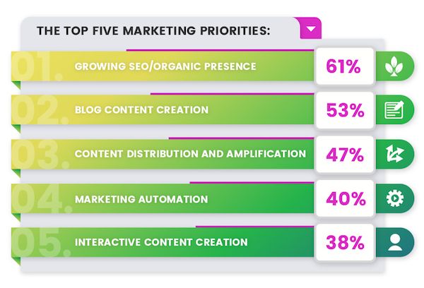 เมื่อถามว่างานเบอร์หนึ่งที่นักการตลาดปีนี้มองว่าต้องทำก่อนงานอื่น การสำรวจของ Reboot Online ซึ่งรวบรวมข้อมูลจากรายงาน State of Inbound พบว่านักการตลาดมากกว่าครึ่งหนึ่ง (55%) ตั้งเป้าเพิ่มยอดเข้าชมเว็บไซต์ โดยงานที่ถูกมองว่าสำคัญที่สุดคือการปรับปรุง SEO และการสร้างเนื้อหา (61% และ 55% ตามลำดับ)