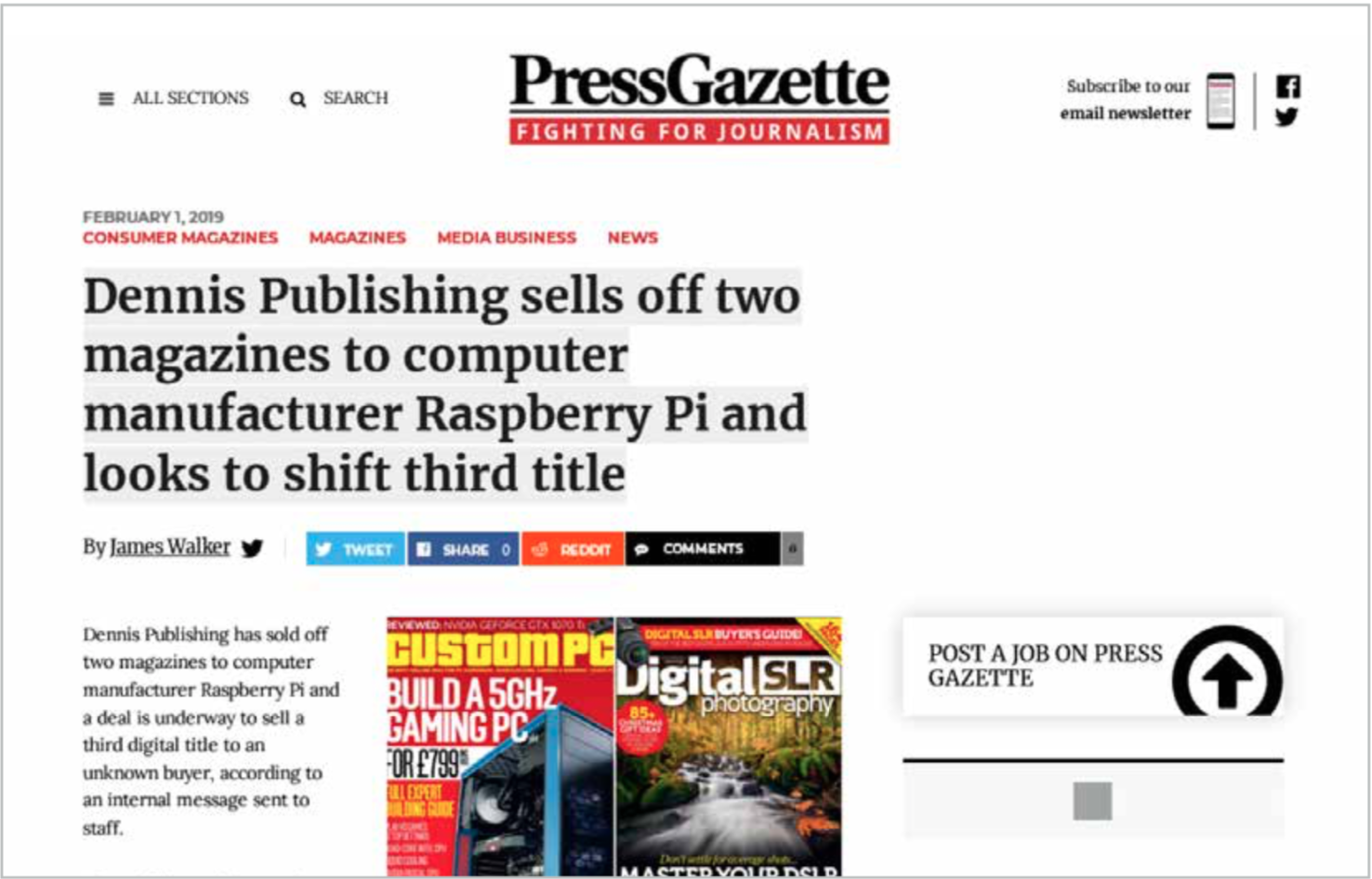 ในปี 2019 ผู้ผลิตฮาร์ดแวร์คอมพิวเตอร์ Raspberry Pi ได้ซื้อแบรนด์นิตยสารของสำนักพิมพ์จากสหราชอาณาจักรชื่อ Dennis Publishing ไป 2 แบรนด์ เมื่อกาลเวลาผ่านไป Raspberry Pi ก็เติบโตขึ้นและขยับขยายกิจการจนกระทั่งทุกวันนี้ในภาคส่วนธุรกิจสื่อของ Raspberry Pi มีนิตยสารเชิงพาณิชย์ถึง 4 นิตยสาร (และนิตยสารสำหรับลูกค้าอีกหนึ่งหัว) ซึ่งมีเนื้อหาเกี่ยวกับวิธีการใช้เทคโนโลยีต่างๆ