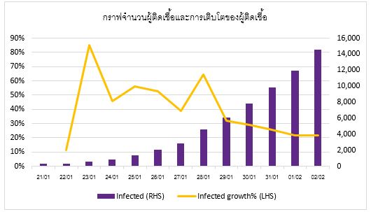 ทั้งนี้สิ่งที่ต้องจับตาดูต่อไป คือ อัตราการเพิ่มขึ้นของผู้ติดเชื้อที่ดูแนวโน้มยังไม่ลดลง โดยหากเปรียบเทียบเหตุการณ์กรณี SARS และ Wuhan Novel Coronavirus ตามรายงานขององค์การอนามัยโลก (WHO) ในช่วงเจ็ดวันตั้งแต่มีการรายงานนั้น SARS มีผู้ติดเชื้อเพียง 456 ราย แต่ Corona virus นี้มีผู้ติดเชื้อ 4,474 ราย จะเห็นได้ว่าแม้เชื้อโรคครั้งนี้จะไม่รุนแรงจนทำให้มีอัตราผู้เสียชีวิตในสัดส่วนมากเท่ากับ SARS แต่มีอัตราการแพร่ระบาดรวดเร็วซึ่งเป็นอีกหนึ่งในปัจจัยที่มีผลกระทบต่อเศรษฐกิจและการลงทุนในปี 2020 นี้แน่นอน