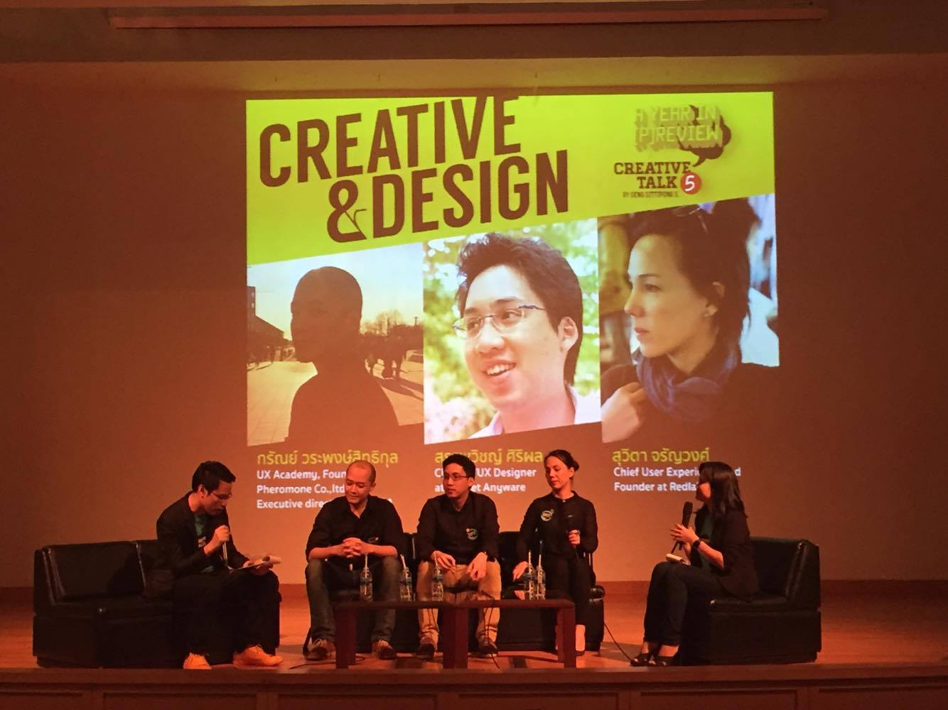 ขอเริ่มกันด้วย Session แรกที่ว่ากันด้วยเรื่อง Creative & Design ผู้เข้าร่วม panel จะมีทั้งหมด 3 ท่าน ได้แก่ คุณกรัณย์ วระพงษ์สิทธิกุล – UX Academy Founder of Pheromone co.,ltd. & Executive director of HUBBA คุณสรรพวิชญ์ ศิริผล – Chief UI/UX Designer at Market Anyware และคุณสิวตา จรัญวงศ์ Chief User Experience and Founder at Redlab