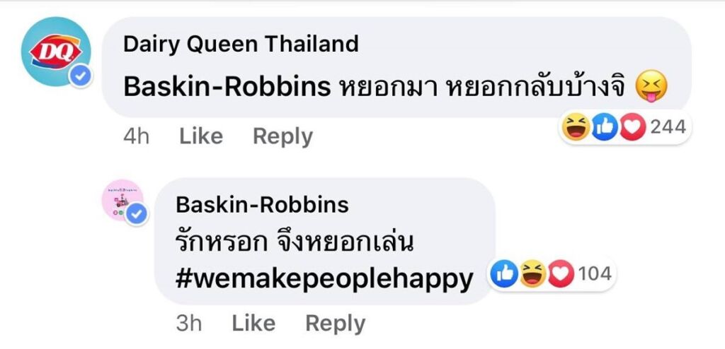 อย่างไรก็ตาม การหยอกล้อของไอศกรีมทั้ง 3 แบรนด์สร้างความบันเทิงให้กับลูกค้าได้เป็นอย่างดี นอกจากนี้ยังสร้างภาพลักษณ์แบรนด์ให้มีความสนุกและเข้าถึงได้ง่าย สำหรับลูกค้าก็คอยติดตามแคมเปญของทั้ง 3 แบรนด์ ได้ทั้งการรับรู้และการมีส่วนร่วมอีกด้วย