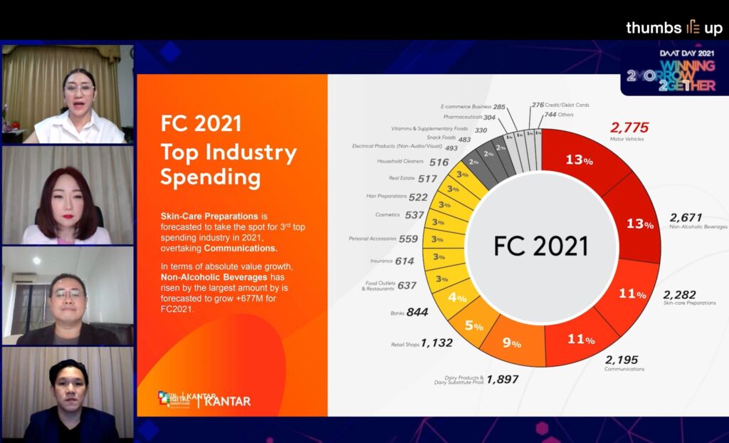 สำหรับอุตสาหกรรมที่มีเม็ดเงินลงทุนบนสื่อดิจิทัลมากที่สุดยังคงเป็น อุตสาหกรรมยานยนต์ 2,775 ล้านบาท ตามด้วยกลุ่มเครื่องดื่มปราศจากแอลกอฮอล์ 2,671ล้านบาท ที่มีการจับจ่ายมากขึ้นจากการล็อกดาวน์ และคนตุนสิ่งของไว้เพื่ออยู่ที่บ้านมากขึ้น
