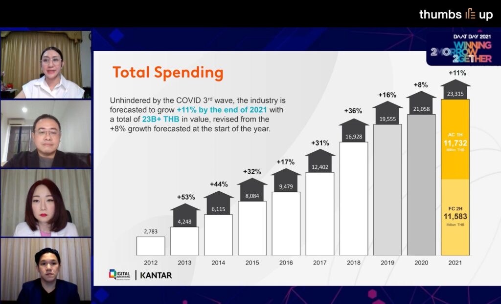 ครึ่งปีแรกของ 2021 มีการลงทุนเม็ดเงินโฆษณาดิจิทัล 11,732 ล้านบาท และคาดว่าครึ่งปีหลังจะมีการลงทุนเม็ดเงินโฆษณาดิจิทัลถึง 11,583 ล้านบาท ทำให้ยอดรวมทั้งปีจะทำได้ประมาณ 23,315 ล้านบาท เติบโตเพิ่มขึ้นถึง 11% เมื่อเทียบกับปีที่แล้วที่เติบโตเพียง 8%