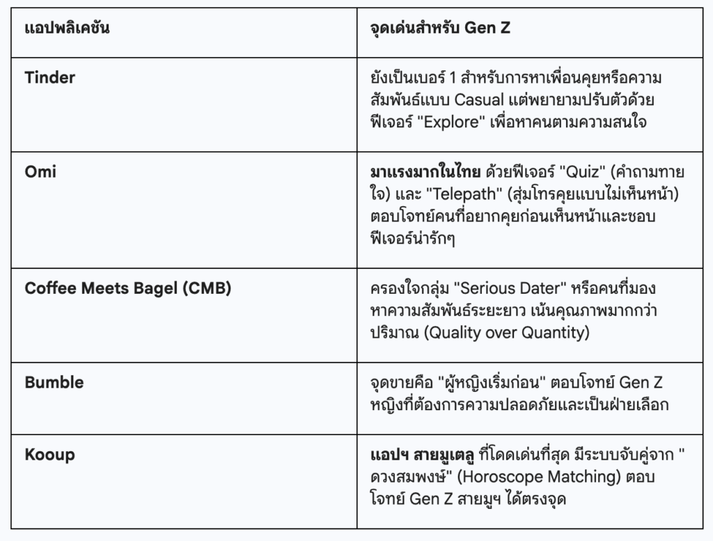 ทำให้ปัจจุบันตลาด Dating App ในไทยยังคงเติบโต แต่รูปแบบการใช้งานเปลี่ยนไปอย่างมาก โดยเฉพาะในกลุ่มคนรุ่นใหม่ โดยแบ่งความพึงพอใจของผู้ใช้งานออกเป็นรูปแบบ ดังนี้