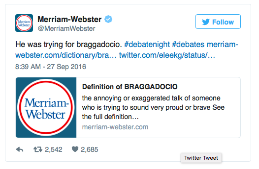 พจนานุกรมภาษาอังกฤษชื่อดัง Merriam-Webster เผยสถิติน่าสนใจกับสำนักข่าว Adweek ว่าการโต้วาทีของผู้ลงสมัครรับเลือกตั้งตำแหน่งประธานาธิบดีสหรัฐอเมริกาที่ผ่านมานั้นทำให้ยอดการค้นหาคำที่ถูกใช้ในการ Debate นี้เพิ่มขึ้นอย่างชัดเจน สูงสุดคือคำว่า “braggadocious” ที่เพิ่มขึ้นถึง 15,500% ส่วนหนึ่งเป็นผลจากการทวีตรายละเอียดคำศัพท์แบบเรียลไทม์ ซึ่งถือเป็นการประชาสัมพันธ์ที่ได้ผลและไม่ต้องเสียสตางค์