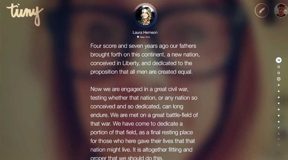 สิ่งที่ Tiny ทำคือการเพิ่มอารมณ์ให้กับโพสต์ข้อความที่มักมีแต่ตัวอักษร ขณะเดียวกัน Tiny จะยังสงวนความเป็นส่วนตัวของผู้เขียนไว้ ด้วยการเพิ่มฟิลเตอร์ที่พื้นหลังหรือ background filter จนทำให้ภาพผู้เขียนไม่ชัดเจนและไม่สามารถเห็นรายละเอียดใบหน้า แต่จะสามารถมองเห็นความเคลื่อนไหวของผู้เขียนได้ระดับหนึ่ง