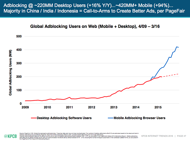 เรื่องนี้ Meeker แสดงข้อมูลจาก PageFair พบว่าปัจจุบัน ผู้ใช้มากกว่า 400 ล้านคนทั่วโลกปิดกั้นหรือ block ads ที่แสดงบน mobile web ตัวเลขนี้ถือว่าสูงมากเมื่อเทียบกับ 200 ล้านคนที่เป็นผู้ใช้เดสก์ท็อป