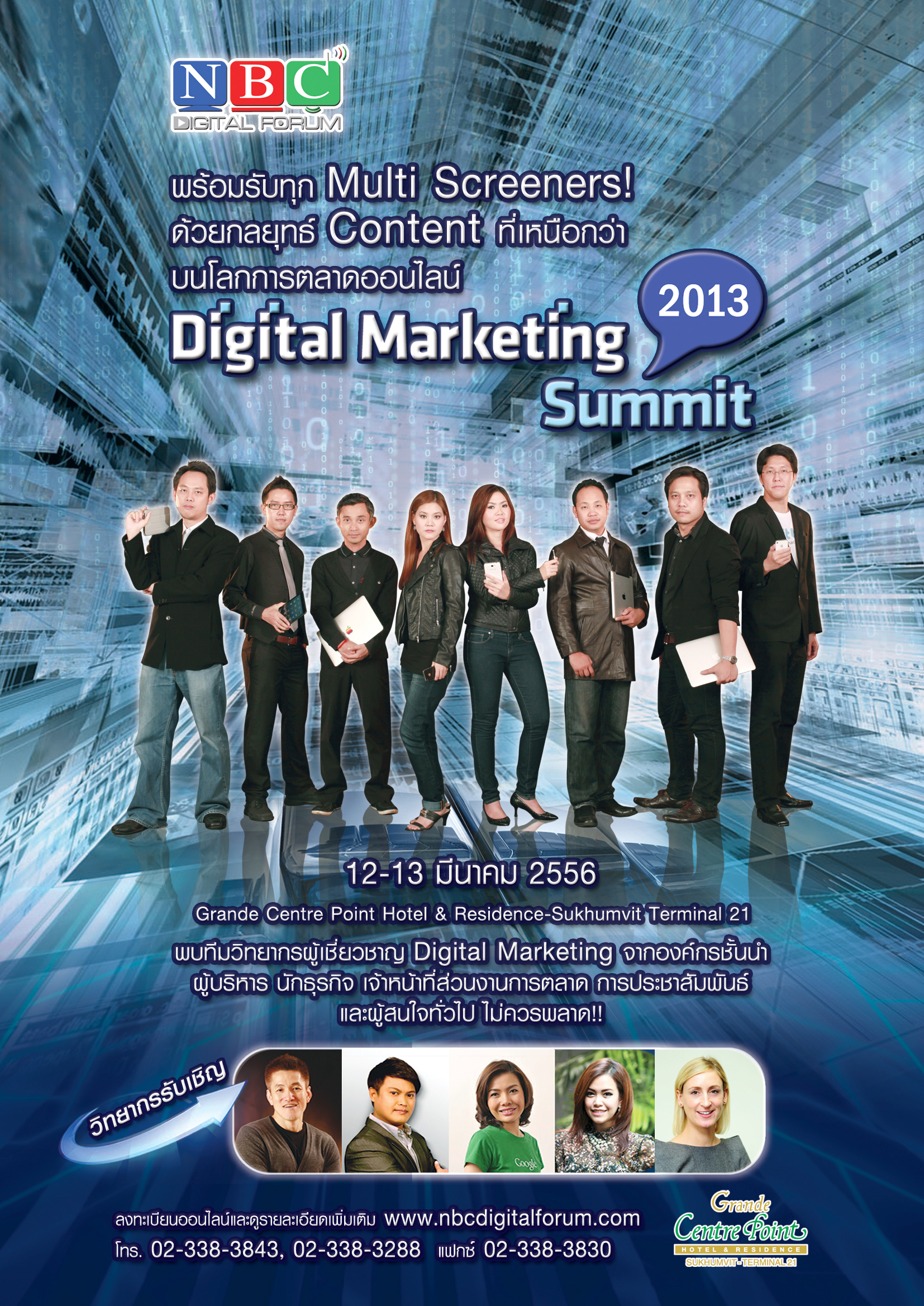 ผู้บริหาร นักธุรกิจ เจ้าหน้าที่ส่วนงานการตลาด การประชาสัมพันธ์ และผู้สนใจทั่วไป ไม่ควรพลาด!!?บริษัท เนชั่น บรอดแคสติ้ง คอร์ปอเรชั่น จากัด (มหาชน) ขอเชิญชวนนักบริหารรุ่นใหม่และผู้ที่สนใจ เข้าร่วมสัมมนาในงาน ?Digital Marketing Summit 2013? ซึ่งจัดขึ้นเป็นปีที่ 2 เพื่อเปิดโอกาสอันยิ่งใหญ่แห่งนวัตกรรมการเรียนรู้ครบวงจร ผ่านรูปแบบการสัมมนาและworkshop กับเหล่าผู้เชี่ยวชาญด้าน การนำสื่อออนไลน์มาประยุกใช้ในเชิงการตลาดรูปแบบใหม่ จากองค์กรชั้นนำที่พร้อมจะถ่ายทอดความรู้ เทคนิคล่าสุด ชี้แนวทางการวางแผนการตลาดได้ตรงจุดรวดเร็วก่อนใคร เข้าถึงกลุ่มลูกค้าเป้าหมายที่แท้จริง