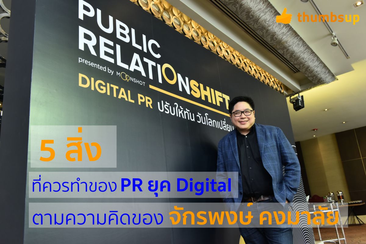 จักรพงษ์ คงมาลัย ผู้ก่อตั้งและกรรมการผู้จัดการ บริษัท มูนช็อท ดิจิตอล จำกัด ได้ขึ้นกล่าวบนเวทีงาน “Public RelationSHIFT : Digital PR ปรับให้ทัน วันโลกเปลี่ยน” โดยให้ความรู้ในหัวข้อ Why PR Needs To Shift ทิศทางใหม่ของ PR ยุคดิจิทัล ที่สรุปให้ PR ยุคใหม่ได้เข้าใจการเปลี่ยนแปลงของโลกว่า