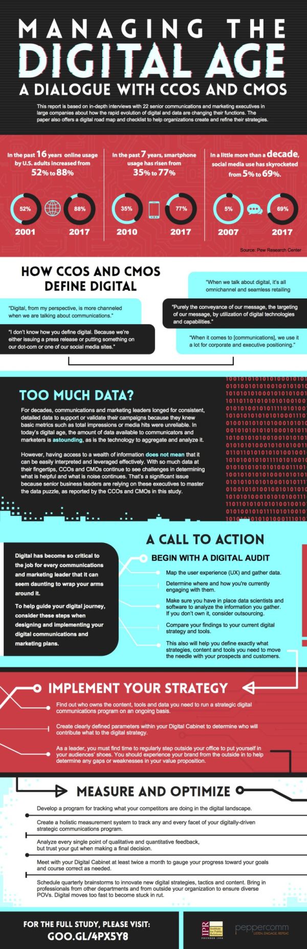 การสำรวจของสถาบันด้านประชาสัมพันธ์หรือ Institute for Public Relations และ Peppercomm ซึ่งถามความเห็นนักบริหารกว่า 22 ราย พบว่าส่วนใหญ่ใช้ 3 ขั้นตอนในการทำ digital transformation ในแผนกการตลาด ซึ่ง 3 ขั้นตอนนี้สามารถเป็นแนวทางที่ยังไม่ล้าสมัยอีกนาน