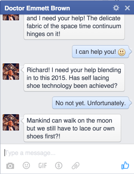 ด็อกเตอร์สติเฟื่อง Doc Brown ตัวละครจากภาพยนตร์อมตะเรื่อง “Back to the Future” กำลังกลายเป็นกิมมิกที่สตูดิโอดัง Universal ใช้สร้างสีสันบน Facebook Messenger ได้อย่างเก๋ไก๋ โดยชาว Facebook สามารถแชตกับด็อกได้ในช่วงเวลาวันที่ 21 ตุลาคม 2015 ซึ่งเป็นวันสำคัญในภาพยนตร์เรื่องนี้ พร้อมกับร่วมมือกับแบรนด์อย่าง Calvin Klein และ Pepsi ซึ่งภาพยนตร์พาดพิงถึงได้ชนิดแนบเนียนสุดๆ