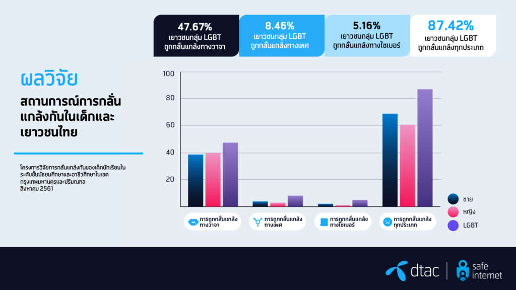 จาก 1,606 กลุ่มตัวอย่างเคยถูกกลั่นแกล้งในสถานศึกษาจนถึงขี้นเสียใจหรือเสียความรู้สึก ที่สำคัญ “LGBT” ตกเป็นเป้าหมายของการกลั่นแกล้งรังแกทั้งในแบบออนไลน์และออฟไลน์ โดยกลุ่มนักเรียนที่เปิดเผยในงานวิจัยว่า เป็น LGBT เผยว่า มีประสบการณ์โดนกลั่นแกล้งทางวาจา แกล้งทางเพศ แกล้งทางไซเบอร์ และถูกรังแกมากที่สุด เมื่อเทียบกับนักเรียนหญิงและชาย